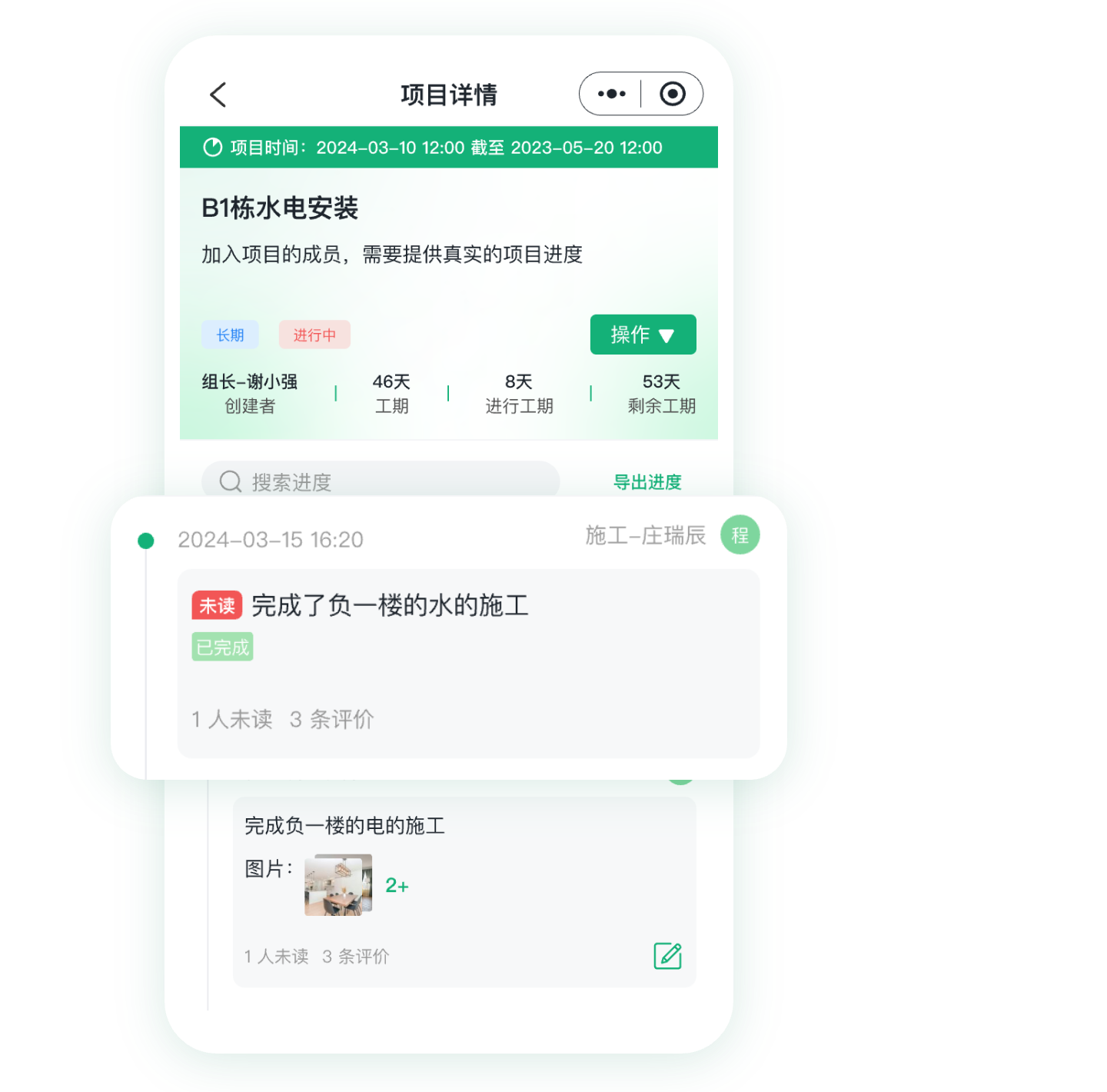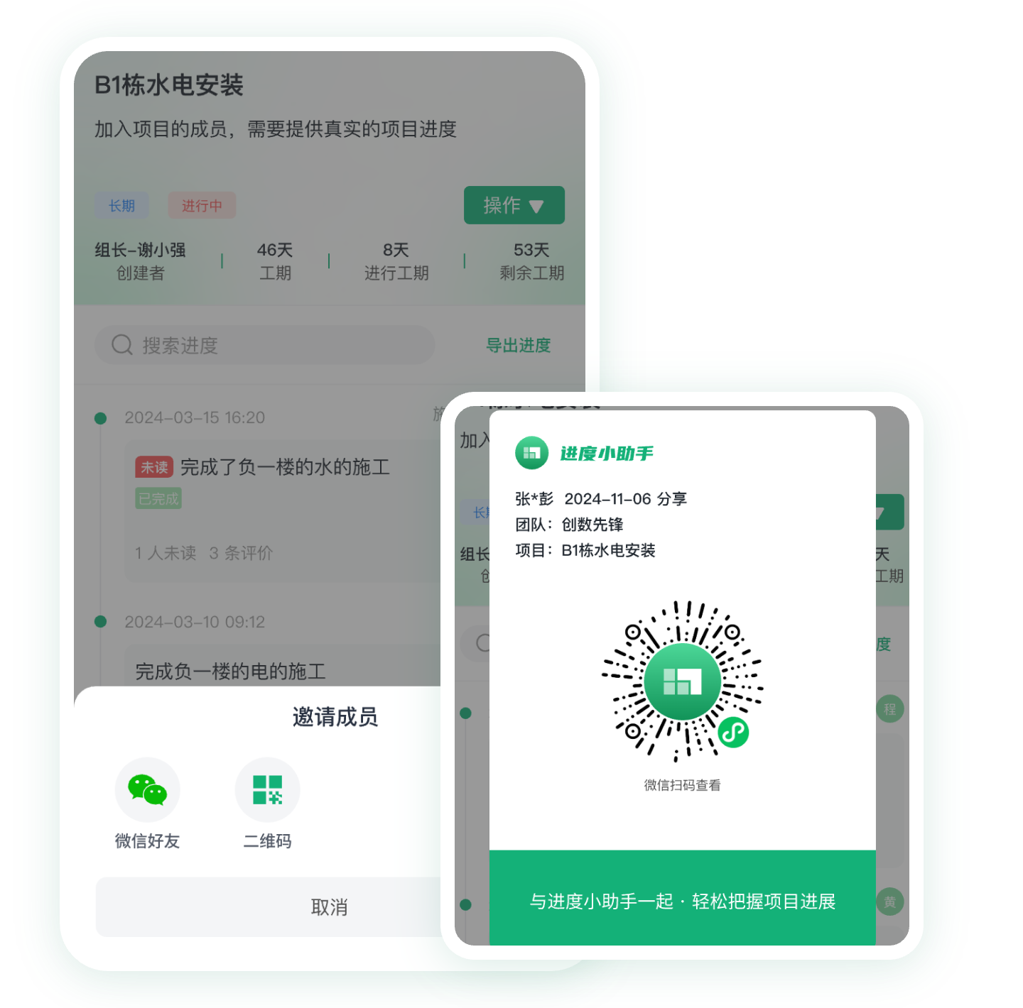 邀请客户加入项目组或单独分享进度,让客户实时了解项目施工情况,及时沟通和满足需求,实现顺利满意交付